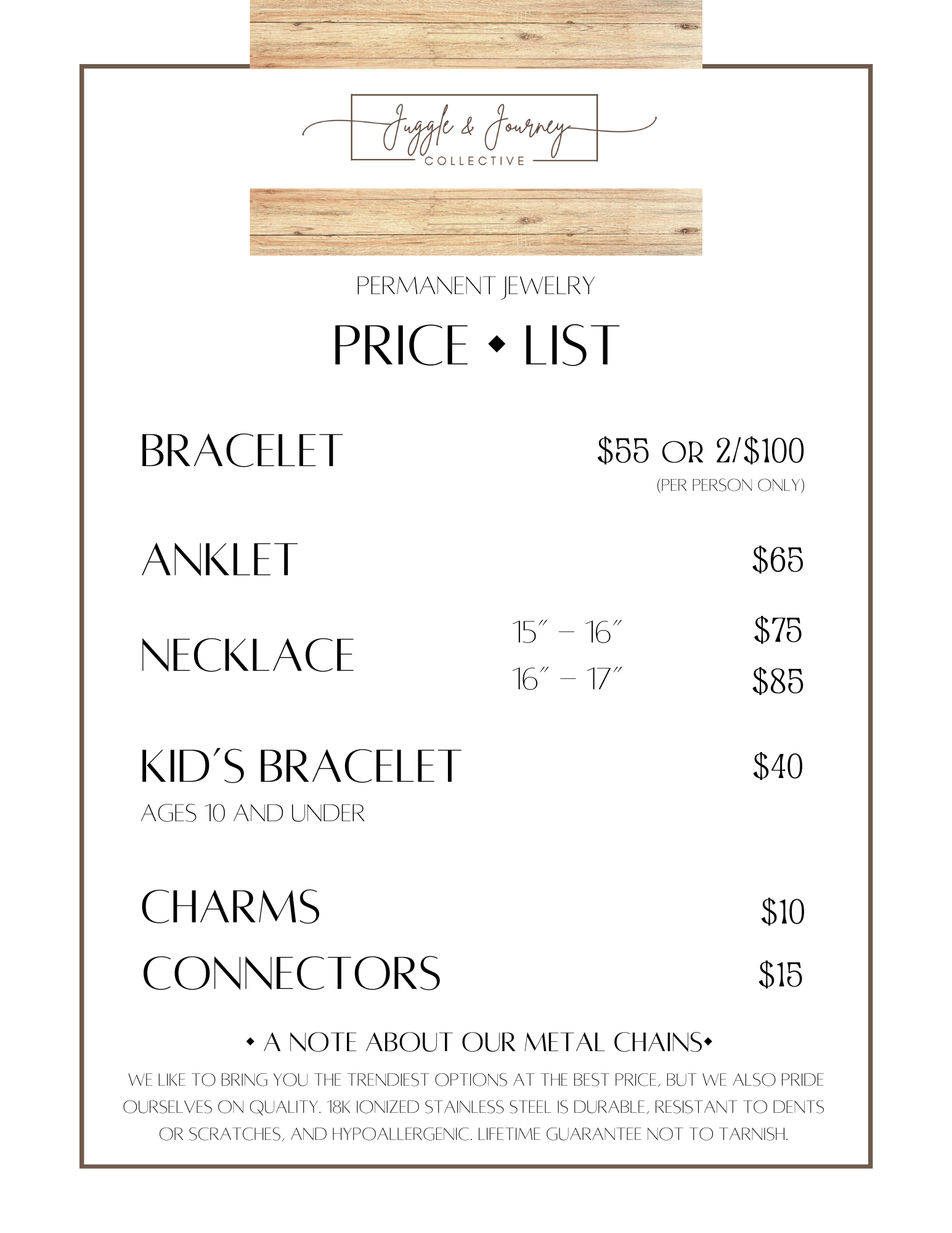 My focus is bringing the trendiest options at the best price. Our permanent jewelry chains are 18K ionized stainless steel- durable, and resistant to dents or scratches. All chains are of the best quality and hypoallergenic. Guaranteed not to tarnish, and all chains come with a lifetime guarantee.